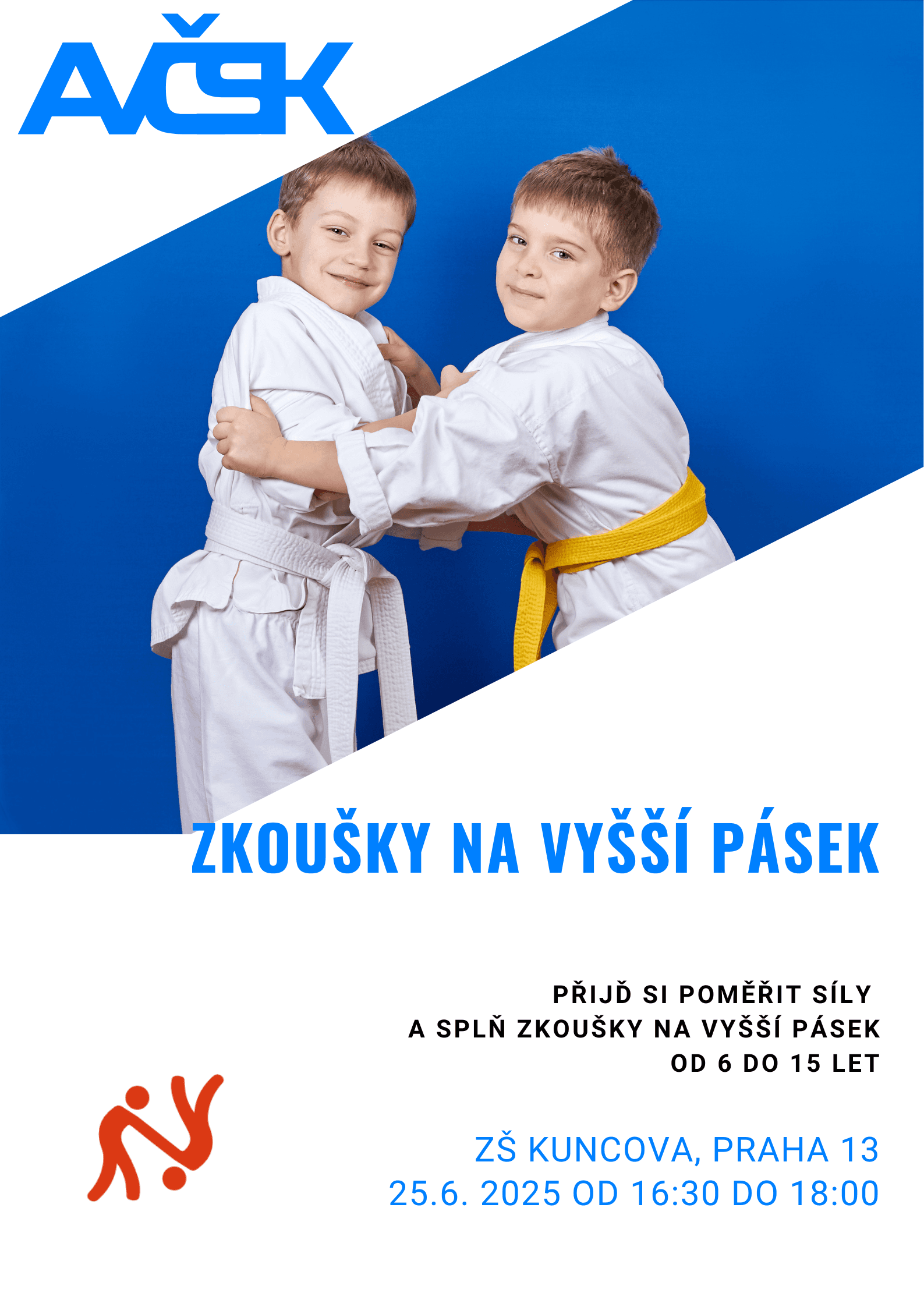 Zveme Vás na náhradní termín zkoušek na vyšší pásek pouze pro Prahu 13. Náhradní termín se koná 25. 6. od 16:30 hod. na ZŠ Kuncova. Přihlaste se přes webovou aplikaci Eos.