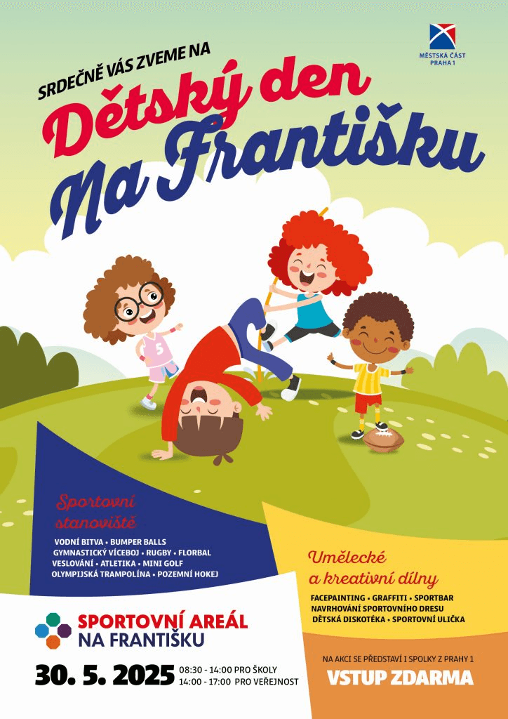 Městská část Praha 1 zve všechny děti, rodiče, školy i širokou veřejnost na tradiční Dětský den Na Františku, který se letos uskuteční v pátek 30. května 2025 ve Sportovním areálu Na Františku. Přijďte si užít den plný pohybu, smíchu a tvořivosti!